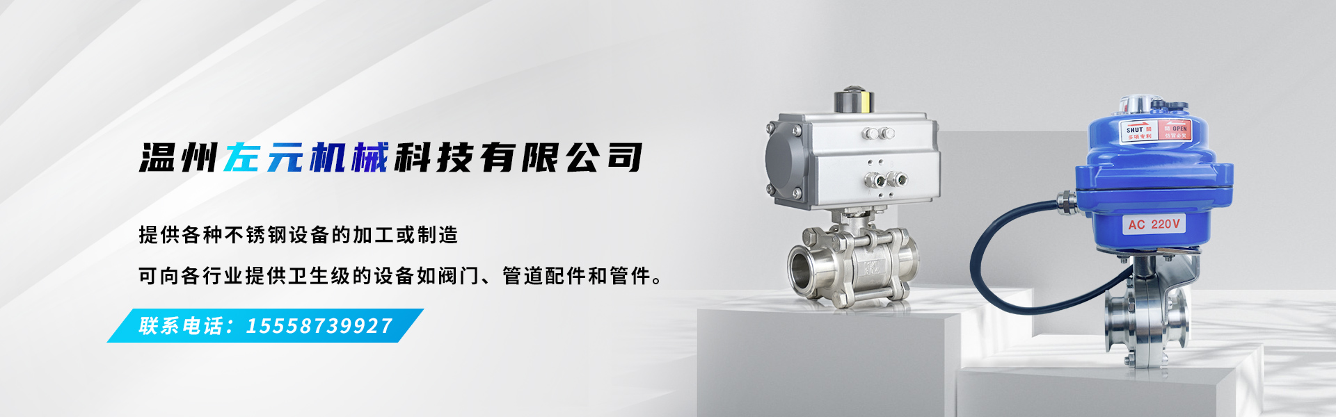 溫州左元機(jī)械科技有限公司成立與 2015 年,位于浙江省溫州市濱海園區(qū)十四路,主要經(jīng)營(yíng)包括衛(wèi)生級(jí)手動(dòng)球閥、氣動(dòng)球閥、電動(dòng)球閥、衛(wèi)生級(jí)手動(dòng)蝶閥、氣動(dòng)蝶閥、電動(dòng)蝶閥、衛(wèi)生級(jí)取樣閥、卡箍、管支架, 以及灌裝設(shè)備系列,管件系列等